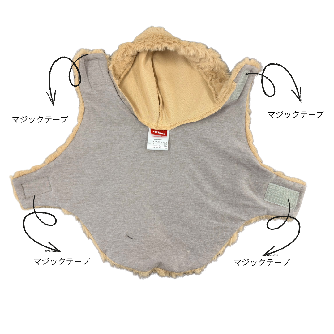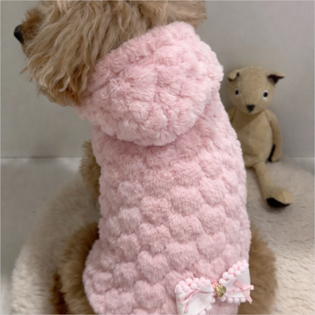 可愛らしいハート柄のファーに、話題のテラヘルツ鉱石を練り込んだ生地を使用した、あたたかく優しい着心地のポンチョです。